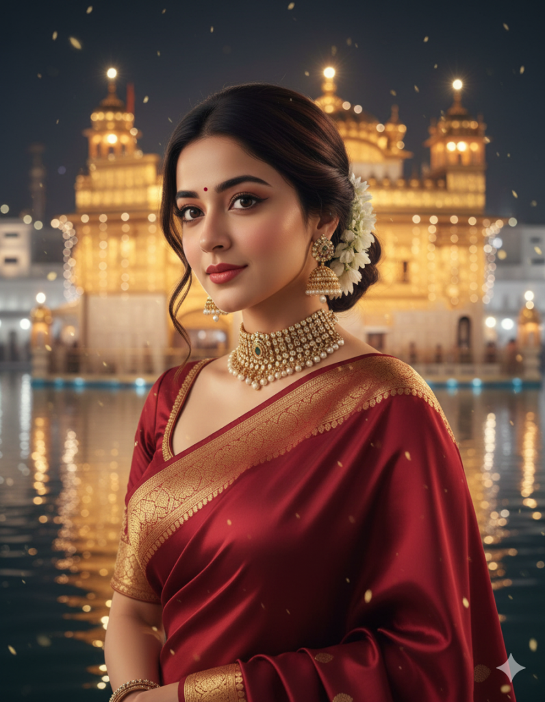 zari border. Jewelry: kundan choker with layered jhumkas. Hair: soft bun with jasmine flowers. Background: Harmandir Sahib (Golden Temple) glowing under night lights. HDR ultra-HD sharpness capturing golden reflections, fabric folds, and divine aura. Aura: serene, divine, timeless ethnic elegance.