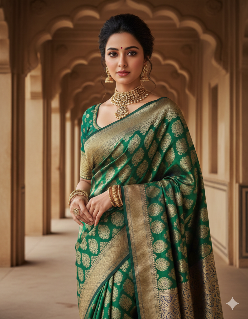 Upload your image > Hyper-realistic editorial styled in a Banarasi silk saree with peacock motifs in emerald green and royal blue. Jewelry: heavy bridal set with gold bangles. Background: ancient palace corridor with arched windows. HDR cinematic sharpness capturing saree texture and jewelry sparkle. Aura: regal, majestic, goddess-like editorial aesthetic.