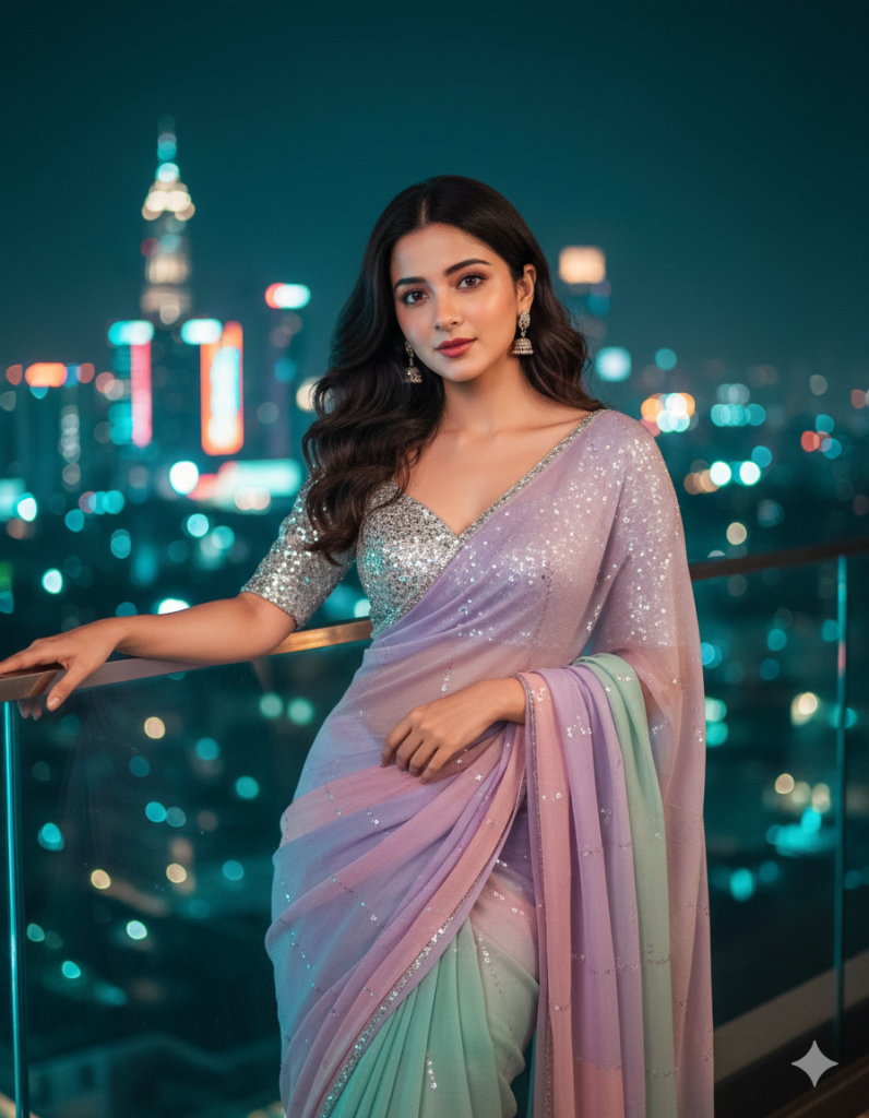 Upload your image > Trendy urban editorial where you wear a pastel saree with sequined blouse. Hair open and flowing with natural waves. Background: rooftop with neon city lights blurred behind. HDR cinematic sharpness capturing drapery, skin glow, and bokeh lights. Aura: modern, stylish, Instagram-trending ethnic chic.