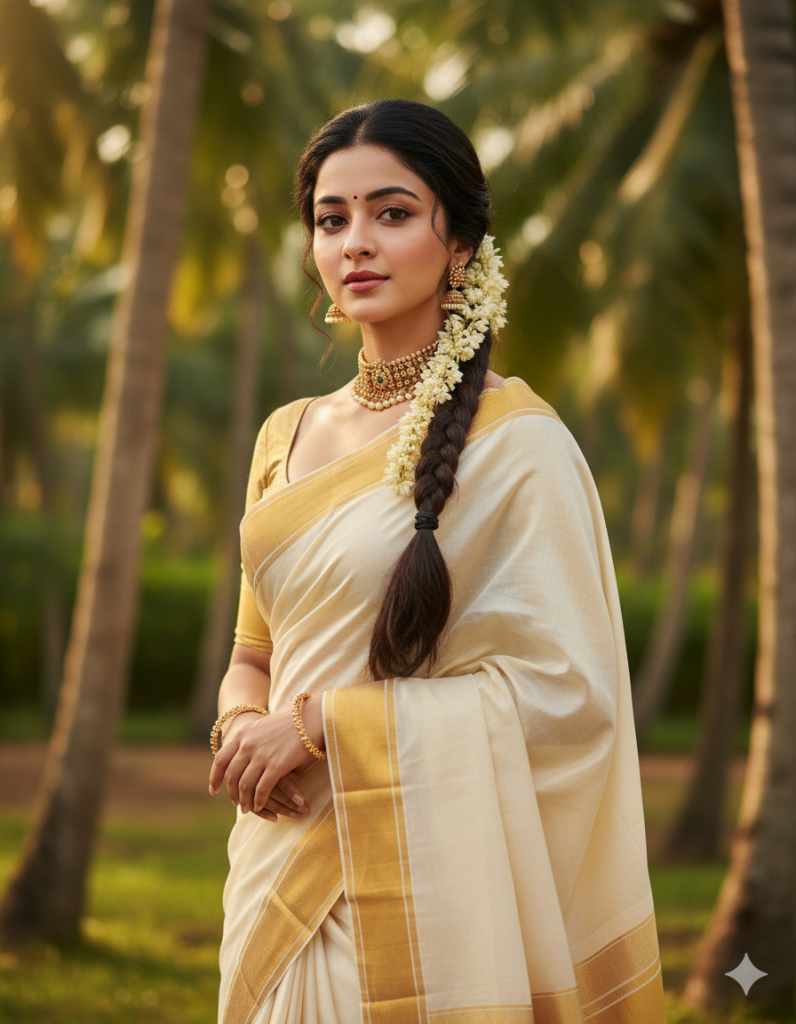 Upload your image > Professional editorial styled in traditional Kerala kasavu saree (ivory with golden border). Jewelry: temple jewelry choker and bangles. Hair in braid adorned with jasmine flowers. Background: lush green coconut grove with soft golden light. HDR cinematic sharpness capturing fabric folds and jewelry textures. Aura: pure, elegant, cultural grace.