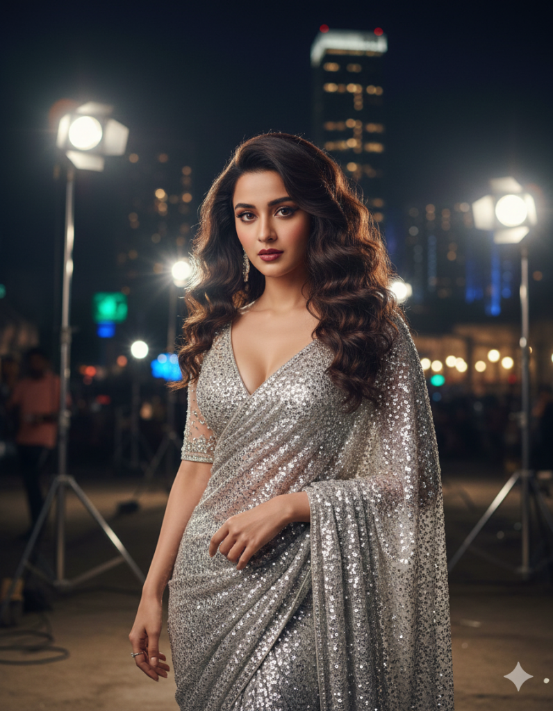 Upload your image > Hyper-realistic portrait styled in Bollywood glam saree – shimmering silver sequins with designer blouse. Hair styled in voluminous curls, bold makeup. Background: film set with glowing spotlights. HDR ultra-HD sharpness capturing sparkle, fabric, and cinematic vibe. Aura: glamorous, star-like, viral-worthy ethnic shoot.