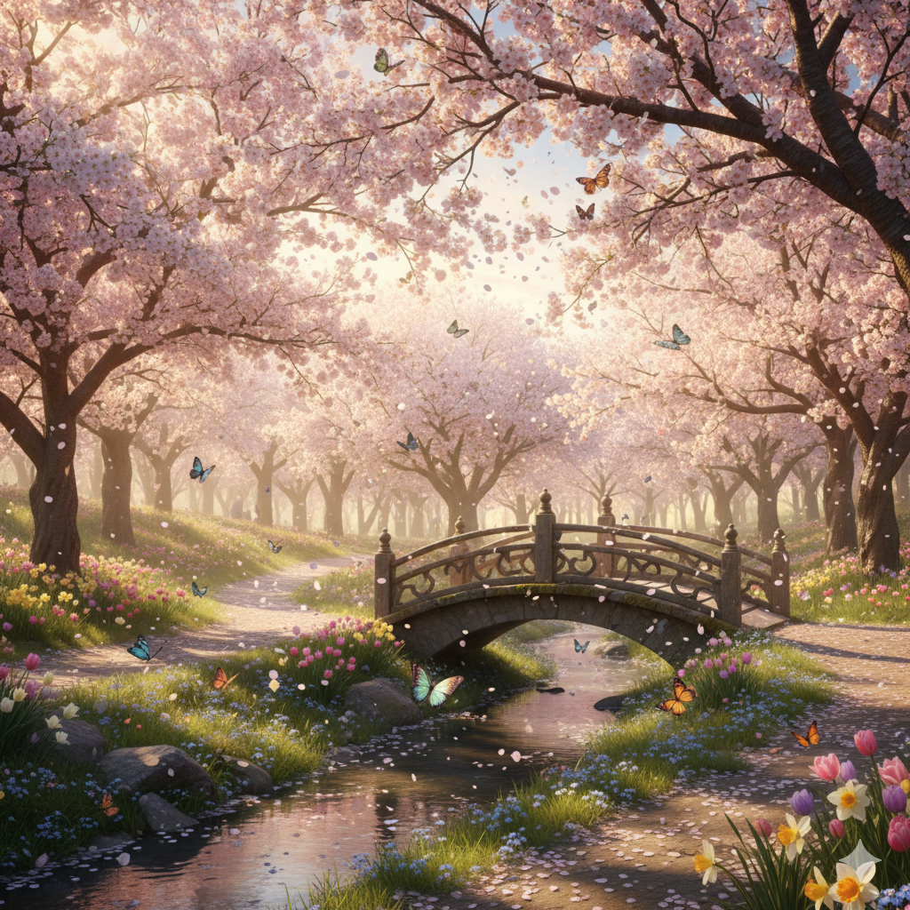 1. A spring forest filled with cherry blossoms, pink petals floating in soft breeze, butterflies