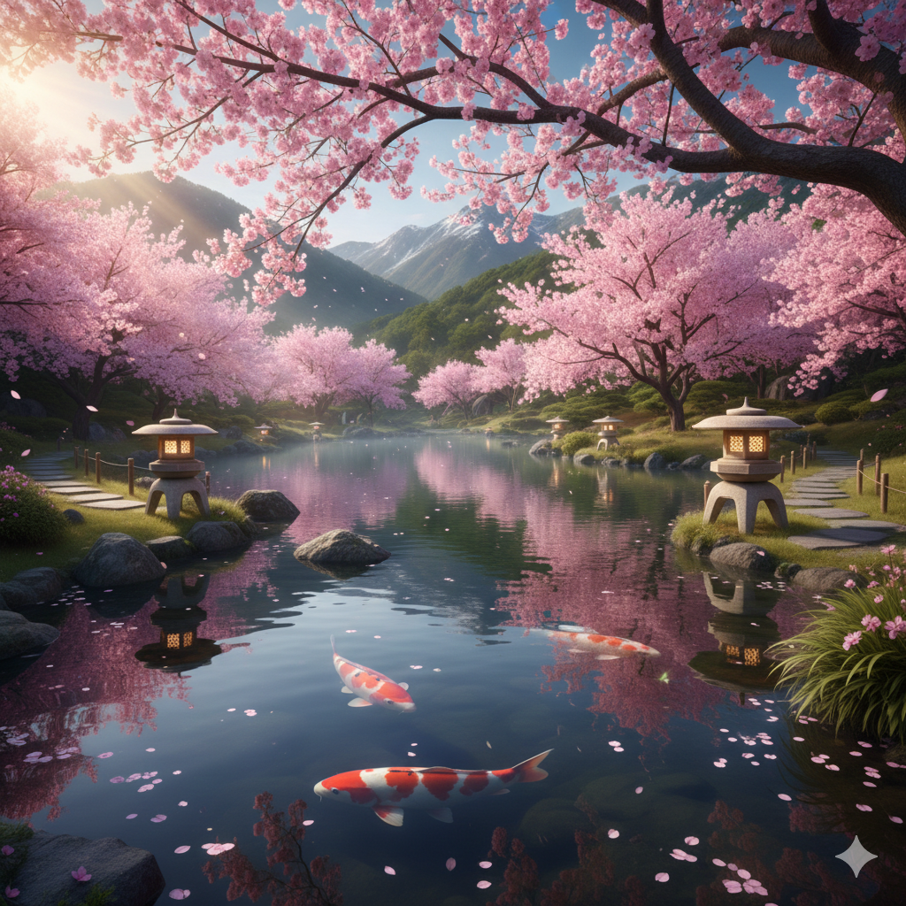 2. A Japanese garden during spring, glowing sakura trees reflecting in calm pond, koi fish