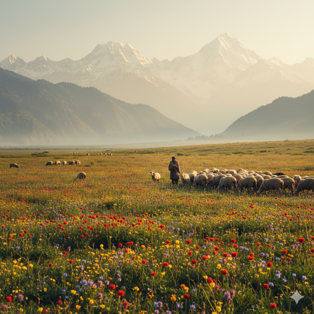 3. A spring meadow in Kashmir, wildflowers covering ground in vibrant shades, snow-capped