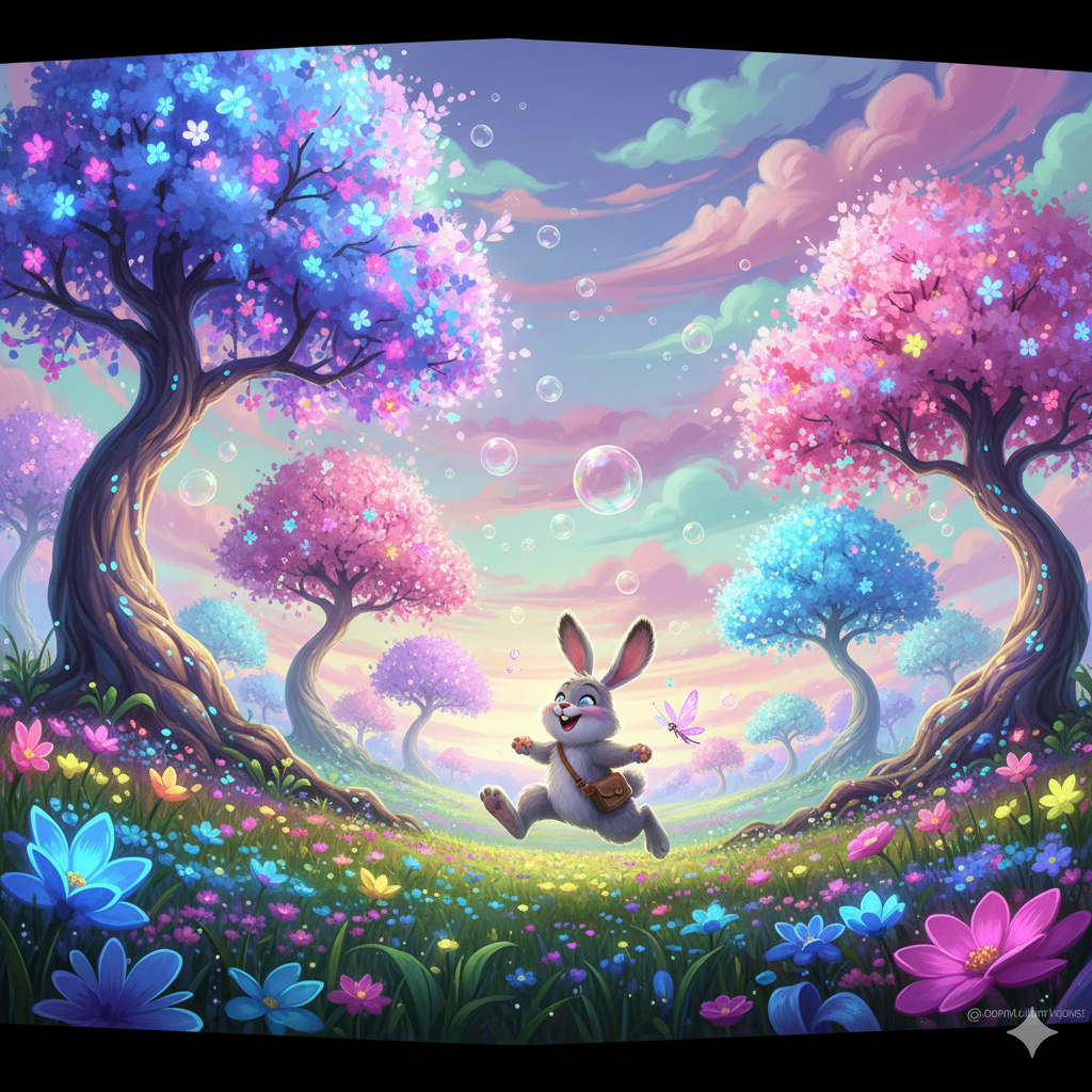 4. A fantasy spring world, glowing crystal trees blooming with neon blossoms, magical rabbits