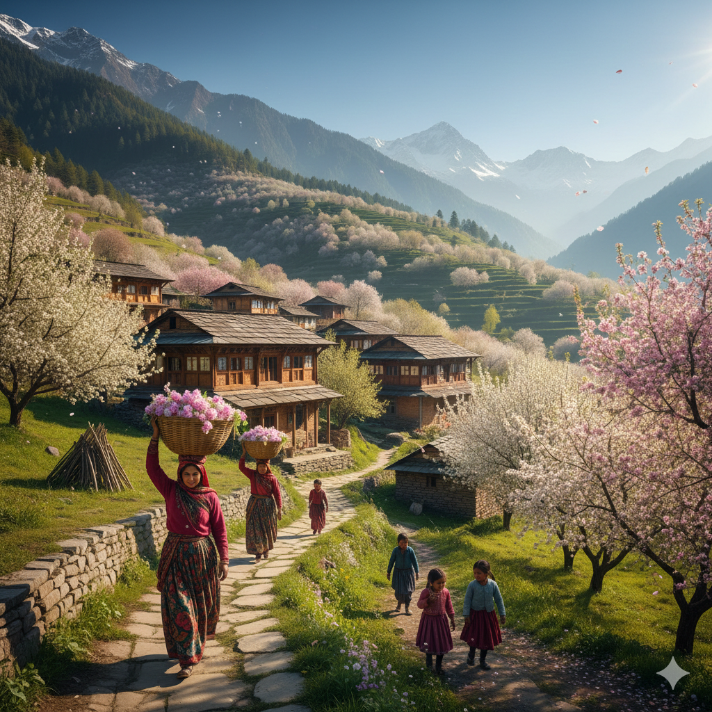 5. A springtime village in Himachal, women carrying baskets of flowers, children playing near