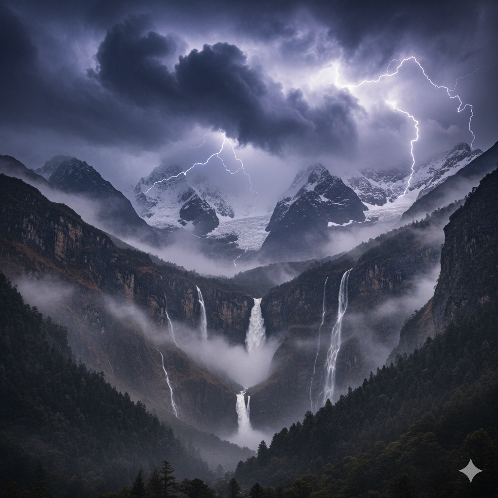 2. A Himalayan valley during a monsoon storm, dense clouds colliding with snowy peaks, waterfalls rushing down cliffs, cinematic landscape photography with dramatic lighting.