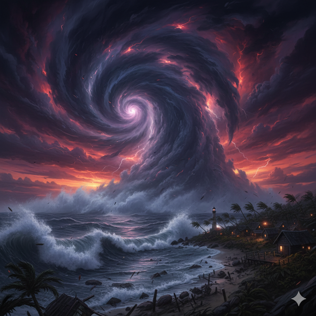 3. A cyclone approaching a coastal village, purple and orange skies glowing, massive storm wall rising over the ocean, ultra-detailed disaster matte painting.