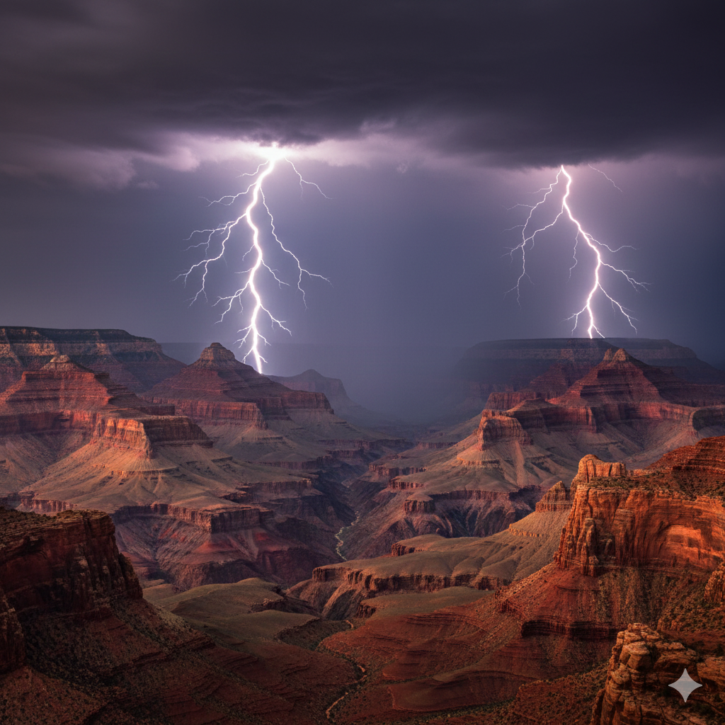 4. An Arizona canyon storm sky, lightning illuminating red rock formations, cinematic HDR photography with intense atmospheric drama.